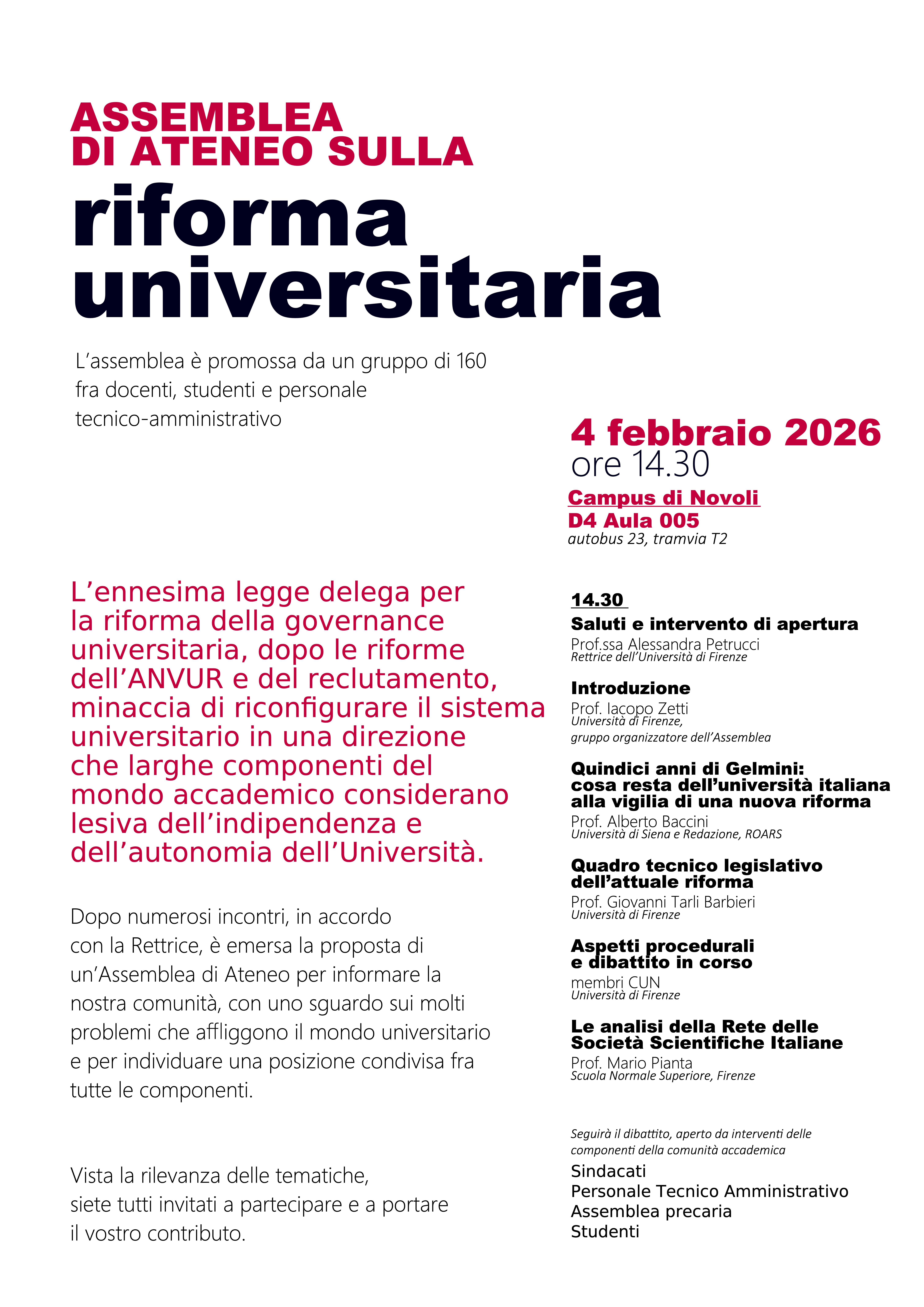 L’assemblea è promossa da un gruppo di 160 fra docenti, studenti e personale tecnico-amministrativo.