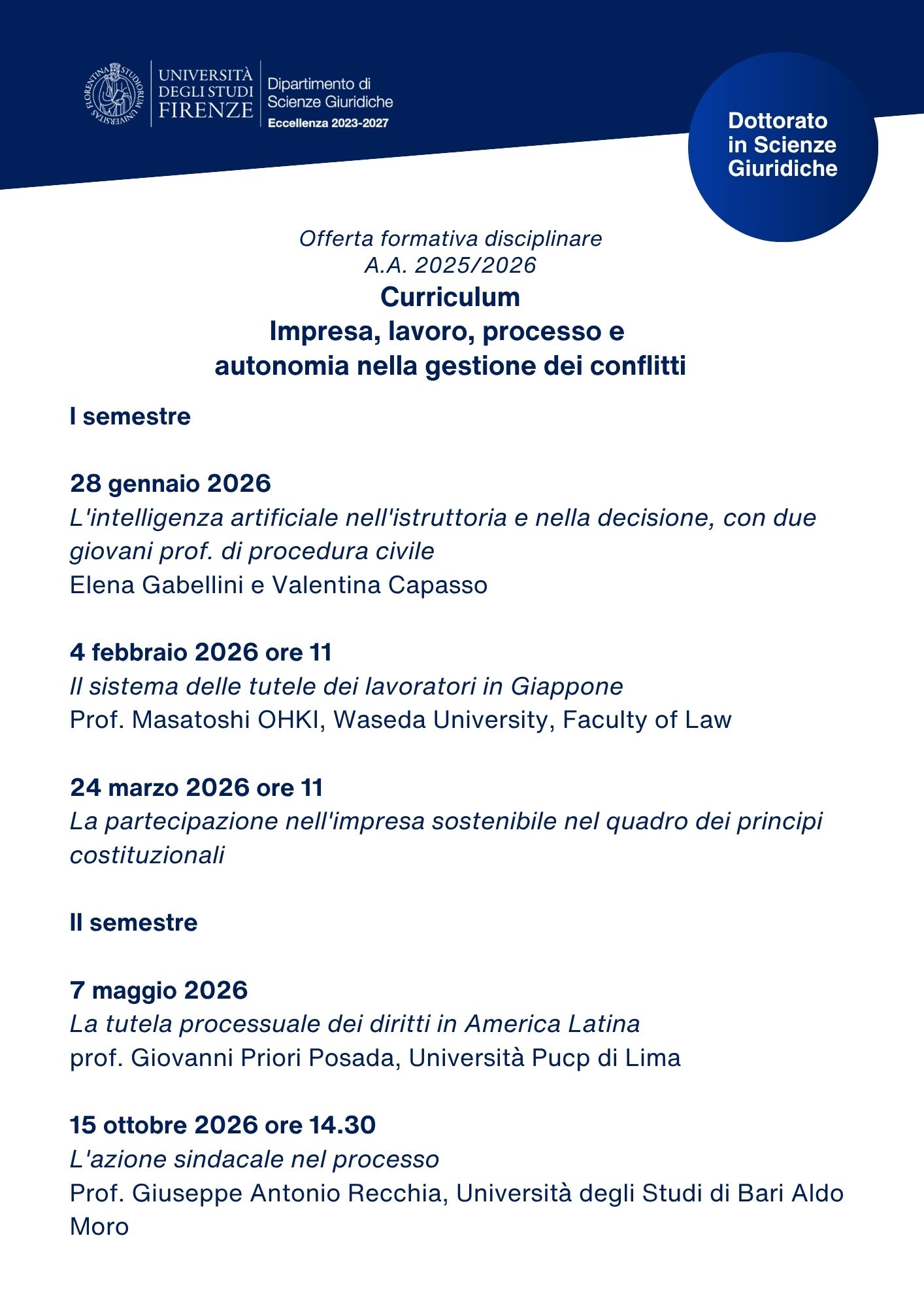 Didattica Dottorato in Scienze giuridicheCurricula e percorsi internazionaliCurriculaImpresa, lavoro, processo e autonomia nella gestione dei conflitti Seminari del curriculum di Impresa, lavoro, processo e autonomia nella gestione dei conflitti